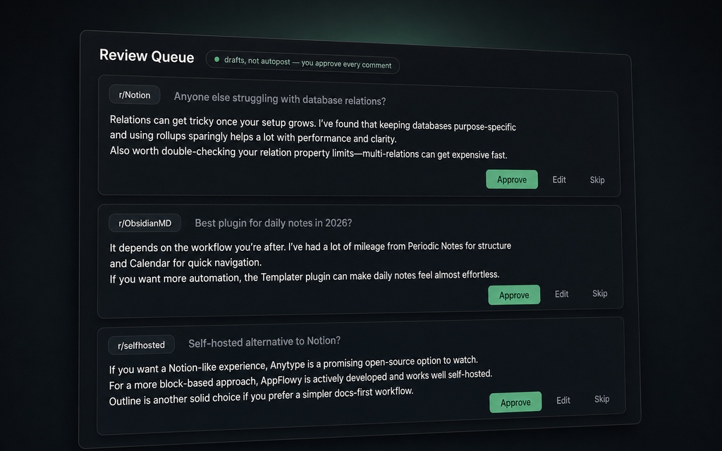 Drafts land in a review queue. Approve, edit, or skip with one click. Nothing posts to Reddit without your final tap — that's the whole point. No autopost, ever.
